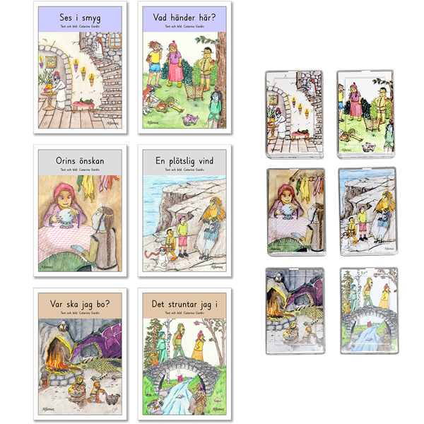 Till varje bok finns även en ask med textkort och laminerade färgbilder hämtade från böckerna. Korten kan användas på olika sätt. Exempel: Lägg en bildserie och berätta vad som händer i boken, memory, spel, dramatisering.