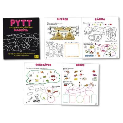 I PYTT Magenta ligger fokus på arbete med kopplingen bokstav/ljud och antal/siffra upp till fem. Det genomgående temat i de 32 sidorna är husdjur och gården.